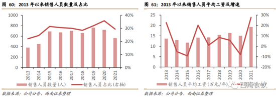 2012-2015年,行业进入深度调整期,公司费用支出开始持续提升,而营收规模徘徊不前,导致费用率高增,净利率不断下降。2019公司陆续修改出台《员工年度绩效考评方案》、《精兵增效方案》等改革举措,持续优化激励考核模式,优化调整薪酬构成,销售人员、管理人员平均薪酬显著提升,薪酬总额稳中有降,考核激励更加高效。2021年起,公司开始推进“三年绩效管理战略”,不断提升经营管理水平。经过深度调整,公司销售费用、管理费用规模得到有效控制,费用率显著下降,净利率拐点向上。