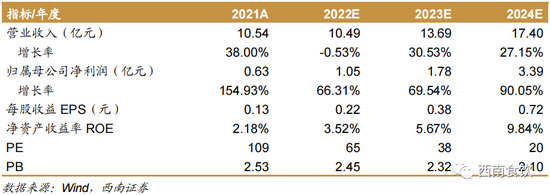 预计公司2022-2024年营业收入分别为10.5亿元(-0.53%)、13.7亿元(+30.5%)和17.4(+27.2%)亿元,归母净利润分别为1.05亿元(+66.3%)、1.78亿元(+69.5%)和3.39亿元(+90.1%),EPS分别为0.22、0.38和0.72元,对应PE分别为65、38和20倍。