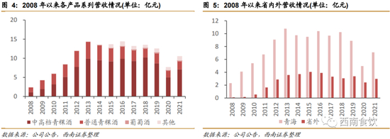 业绩情况:2013-2015年白酒行业经过深度调整,2016年行业开启复苏。公司因聚焦做大“青稞酒品类”,且聚焦百元以下价位与其他地产酒进行竞争,错失品牌塑造和产品结构升级的机遇。2019年以来,公司积极调整战略方向,聚焦资源于产品结构升级,重点布局100-200元价位,倾力打造500元价位国之德G6大单品,产品结构显著优化。此外,公司积极布局省外市场,借助清香型白酒势能回归,不断开拓省外市场,成长空间显著扩大。2020年以来,疫情影响下使得公司调整效果难以显现,当前积聚的经营势能强劲,行业复苏背景下极具成长弹性。