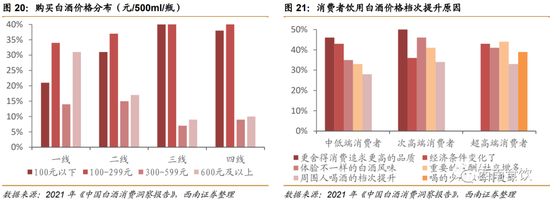消费升级除了收入提升这一核心推力之外,消费观念的改变、品牌意识的增强、消费氛 围的影响等也是重要的驱动力。“茅五泸”在打开价格空间的同时,一线城市在消费结构上 呈现出高端消费占比大于次高端、中端消费占比大于低端的特征,而低线城市低端消费占比 仍较高,一线城市消费升级趋势有望向三四线城市传导,带动次高端和高端消费占比不断提升。