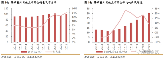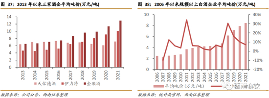 名酒销量占比依然较低,未来提升空间广阔。2021年上市酒企销量(不含顺鑫)市占率仅为14.1%(剔除顺鑫原因主要系其产品多为低端酒且在上市酒企销量中占比超40%,剔除之后能够更好反映名酒销量和吨价发展趋势),名酒销量占比依然较低,未来提升空间广阔。上市酒企(不含顺鑫)销量由2015年的91.2万吨提升至2021年为100.6万吨,年均复合增速为1.6%;2021年虽不断受疫情扰动,但销量仍实现了一定修复。与此同时,受益于直接提价和产品结构升级,平均吨价由2015年的12.2万元/吨稳步提升至2021年的30.1万元/吨,年均复合增速达16.2%。