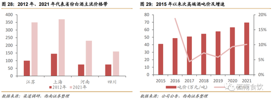 头部打开价格空间,引领行业产品结构升级。在居民收入提高和高收入群体不断壮大的 背景下,中高档白酒消费升级如火如荼。本轮复苏以来,高端“茅五泸”一批价不断走高, 一线名酒提价充分打开价格空间,有序引领行业升级。在一线名酒提价效应带动下,从价的角度看,通过直接提价和产品结构升级,行业平均吨价稳步上移;从量的角度看,随着主流价格带上移,过去中低端消费需求转移至中高端、次高端,由此带来量的增长。