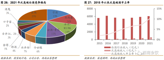 高端赛道壁垒极高,品牌构筑核心竞争力。茅台、五粮液、泸州老窖均多次蝉联中国名酒,品牌积淀和消费者认知极为深厚,是高端赛道的成熟品牌。高端市场稳步扩容的背景下,“茅五泸”三家成熟高端品牌之外,部分兼具品牌力和品质优势的企业开始发力高端。受茅台需求外溢和酱香热的影响,青花郎、国台15年等酱香品牌表现突出;汾酒作为清香白酒龙头,具有广泛的消费者基础,且品牌力突出,其复兴版30在高端市场影响力持续扩大。