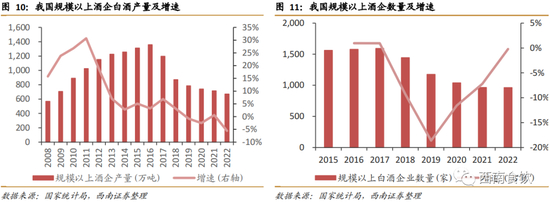 白酒产量见顶回落,业内竞争占据主导。2002-2012年是白酒行业的黄金十年,行业规模快速扩容;白酒行业三年深度调整之后,居民品牌和健康意识快速崛起,“少喝酒,喝好酒”成为全社会共识。伴随“限制三公消费”及“严查酒驾”等,白酒消费更加理性,规模以上白酒企业产销量见顶回落;2022年规模以上白酒产量(可比口径)为671万吨,同比-5.6%;规模以上白酒企业数量由2015年的1563家减少至2022年的963家,行业已转变为存量市场,业内竞争占据主导,且竞争态势愈发激烈。
