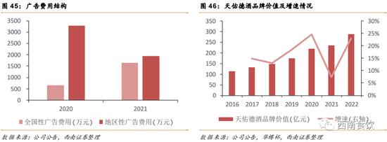 营销投入高举高打,品牌价值不断提升。公司结合市场布局规划,不断优化品牌宣传费用结构,持续提升费用投放效率。为配合公司产品全国化布局,通过国家级媒体拔高品牌形象,增加了全国性广告费用支出。通过立体化、系统化的推广和宣传,天佑德的品牌价值实现了快速跃迁,在2022年“华樽杯”中国酒类品牌价值评选活动中,天佑德的品牌价值由2016年的114亿元提升至2022年的289亿元,品牌力实现了快速增强。