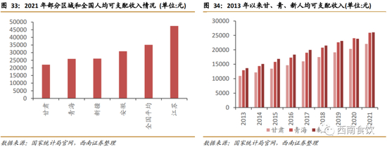 西北经济快速崛起,有力支撑消费升级。当前甘肃、青海、新疆的人均可支配收入与内地仍具较大差异,但伴随着国家西部大开发战略的持续推进,西部经济进入快速发展期,三省人均可支配收入大幅提升。2013-2021年三省人均可支配收入复合增长在9%左右,为消费升级奠定了坚实基础。