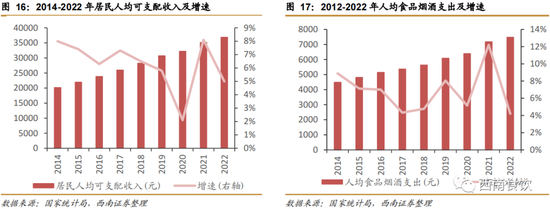 随着中国经济快速发展,城镇居民人均可支配收入和人均食品烟酒支出稳步提升。最近五年居民人均可支配收入增速在7%左右,居民收入的稳步提升为消费升级奠定坚实基础。与此同时,居民人均食品烟酒支出从2014年的4494元稳步提升至2022年的7481元,年化复合增速为6.5%,保持较快增长。