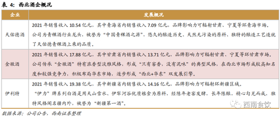 本土不乏优质产品,错失机遇遭受挤压。西北地区并不缺乏优质白酒品牌,天佑德酒为青稞酒行业龙头,被誉为“中国青稞酒之源”,在青海及周边市场具有深厚的品牌基础;伊力特发源于建设兵团,“新疆第一酒”地位坚实,具有广泛的消费者基础;金徽酒产品具有“生态酿造、低温甜润”的特有品质和“只有窖香、没有泥味”的典型风格,市场占有率一直居甘肃省之首。