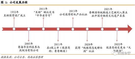 第一阶段(-1952):八大作坊源远流长,互助酒厂开启辉煌。青海省互助县酿酒历史悠久,大约有4000年青稞酒酿造史、600余年天佑德品牌史、400年大曲白酒史,明国时期是西北知名的“高原酒镇”。较有名气的酿酒坊包括天佑德、文玉合、兴义德、世义德等八大酿酒作坊,其中天佑德酒因其品质醇香诱人,畅销全省及甘肃一些地区。1952年,地方政府整合老八大酿酒作坊,组建了互助酒厂。