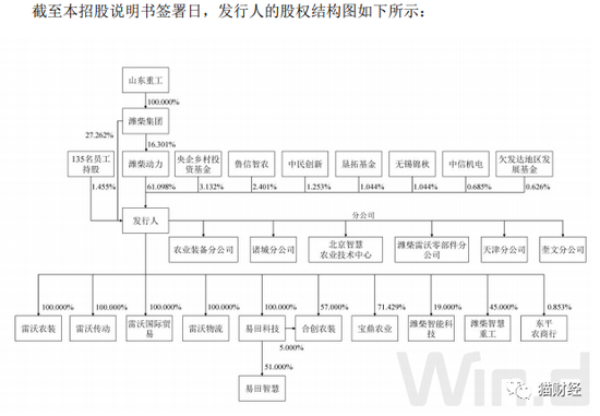 截至招股说明书签署日,潍柴集团持有潍柴动力16.3%股份,为潍柴动力控股股东。山东重工持有潍柴集团100%股权,为潍柴集团控股股东,山东重工通过潍柴动力、潍柴集团合计控制公司88.36%股权,为潍柴雷沃的实际控制人。
