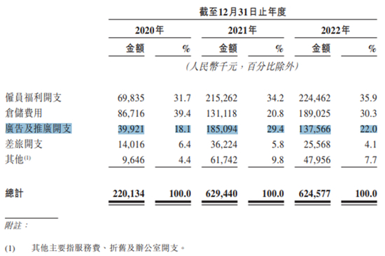 报告期内,锅圈食品的销售及分销开支分别为2.20亿、6.29亿、6.25亿,分別占收入的7.4%、15.9%及8.7%,三年销售费用合计14.74亿元。其中,广告及推广开支分别为3992.1万、1.85亿、1.38亿,占销售费用的比例分别为18.1%、29.4%、22.0%。
