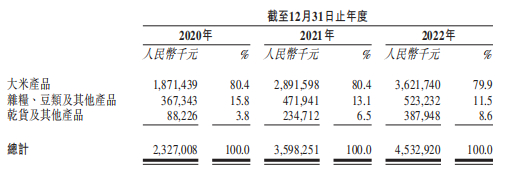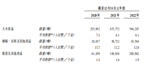 招股书显示,2020年-2022年,公司大米产品的销量分别为25.6吨、47.58吨、59.43吨,2021年-2022年同比分别增长85.86%、24.91%;而同期大米产品的平均售价分别为7.3元/千克、6.1元/千克、6.1元/千克。