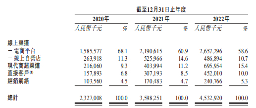 2020年-2022年,公司来自电商平台和线上自营店渠道的销售额分别为18.49亿元、27.17亿元、31.44亿元,分别占各期营业收入的79.4%、75.5%、69.3%。