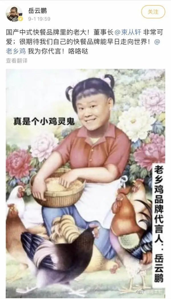 2020年,束从轩用个人账号在微博上喊话,邀请岳云鹏担任老乡鸡品牌代言人。
