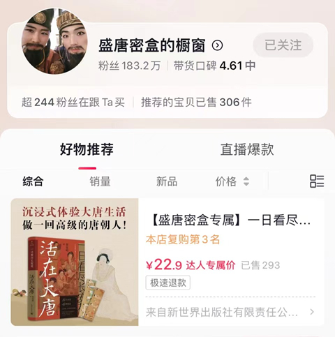 此外,“盛唐蜜盒”抖音号目前仅上线了一款名为“一日看尽长安花:活在大唐”的书籍,购买量为293件。