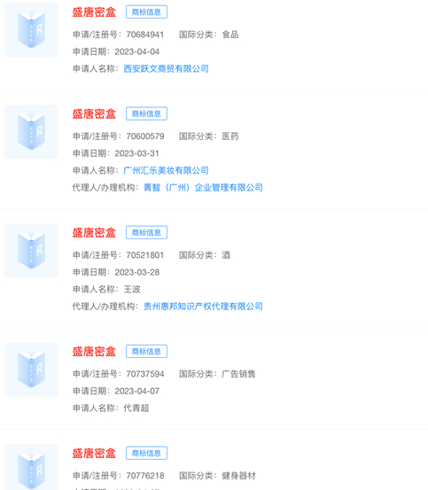 天眼查App数据显示,“盛唐密盒”被多方申请注册商标,申请人包括广州某美妆公司、山东某物业管理公司以及多个自然人,国际分类涉及广告销售、医药、健身器材等,当前商标状态多为申请中。