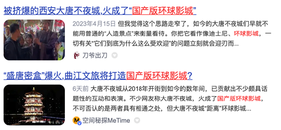 周海涛也认同钟晖的观点,其认为,相比较迪士尼有强大的配套经济支撑的全球性IP,大唐不夜城到如今也就火了一个短视频刷来的不倒翁小姐姐和盛唐蜜盒,可这种火爆并无真正的实体做根基。“大唐不夜城是曲江的大唐不夜城,环球影城是世界的环球影城。”周海涛直言。