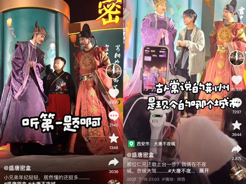 盛唐蜜盒火了,如今到了西安和还没来得及到西安的人都知道,西安有个大唐不夜城,大唐不夜城有个房玄龄和杜如晦,两位脱口秀演员因为语言风格非常搞笑,又被调侃为“汉语言博士再就业”“董宇辉2.0”。