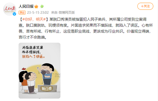 5月15日,人民日报发表短评:某脱口秀演员被指冒犯人民子弟兵,其所属公司受到立案调查。脱口莫脱轨,玩梗须有度。片面追求笑果而不惜踩线,就陷入了误区。心有所畏、言有所戒、行有所止,这应是职业底线,更该成为行业共识。价值观立得端,言行才不会跑偏。