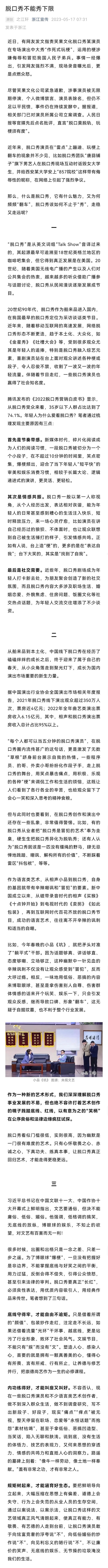 此外,5月17日,浙江省委宣传部官方微信公众号“浙江宣传”发表文章《脱口秀不能秀下限》,全文如下: