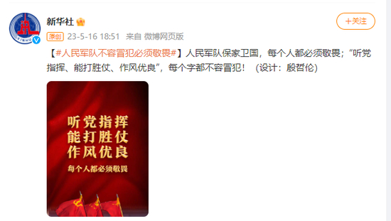 5月16日,新华社发布微博:人民军队保家卫国,每个人都必须敬畏;“听党指挥、能打胜仗、作风优良”,每个字都不容冒犯!