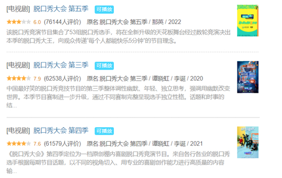 豆瓣显示,笑果的两大王牌节目正在走下坡路,《脱口秀大会5》豆瓣评分逐渐走低,《吐槽大会6》至今杳无音信。越来越多的网友开始批评笑果的段子不再好笑。
