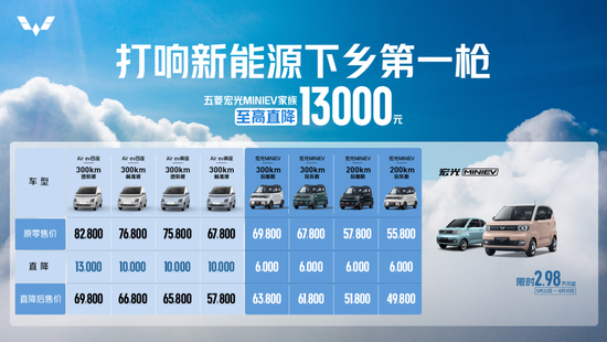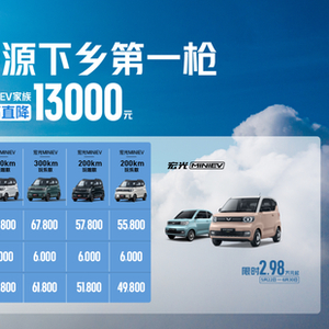 5月22日,上汽通用五菱宣布,即日起,被称为“国民神车”的五菱宏光MINIEV家族全系限时(5月22日~6月30日限时)2.98万元起售,至高直降1.3万元,正式打响2023新能源汽车下乡第一枪。
