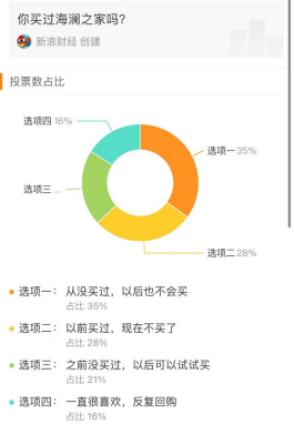 新浪财经发起的一份千余人参与的投票显示,有35%的人从没买过海澜之家,以后也不会买,28%的人曾经买过海澜之家但如今已不是其客户群体,仅有21%和16%的人表示以后可以尝试买海澜之家和反复回购。