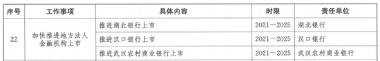 根据湖北省人民政府2022年初印发的《湖北省金融业发展“十四五”规划》,支持地方法人金融机构引入合格战略投资者,加快推进湖北银行、汉口银行、武汉农商银行等重点法人金融机构上市融资。支持地方法人银行设立理财子公司,积极推进省农村信用联社改革,开展投资管理型乡镇银行试点。