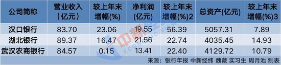 三家银行营收和净利润均实现“双升”,其中汉口银行的增速最快,净利润同比增长达56.39%。湖北银行和武汉农商银行的净利润增速基本持平,均超20%。