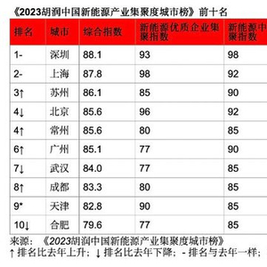 6月19日发布的《2023胡润中国新能源产业集聚度城市榜》显示,深圳、上海、苏州位列前三,北京、常州则并列第四,广州、武汉、成都、天津和合肥分列6-10位。