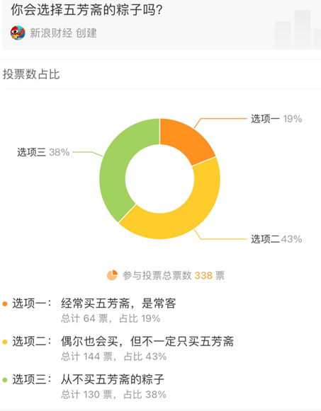 新浪财经发起的一份338人参与的投票显示,有38%的人并不喜欢五芳斋,表示自己从来不买,另有将近一半的消费者表示自己偶尔买过五芳斋,作为粽子龙头,五芳斋的忠实粉丝仅占比19%