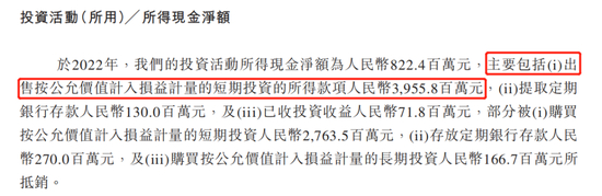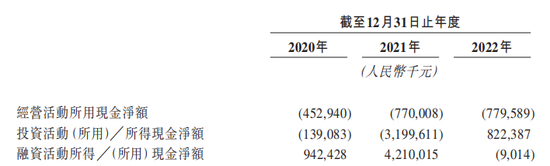 公司一直靠着融资来弥补经营和投资的亏空,为企业续命。拿着股东的钱大手笔投资。2021年有近32亿元的净投资支出。公司2022年投资活动净现金流为正,主要是由于一锤子买卖,出售了价值39.55亿元的短期投资,剔除掉该笔不可持续的资产出售的影响,其2022年投资活动现金流依然为净流出状态。