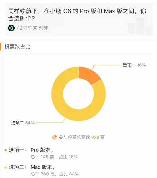 不仅如此,在同一续航标准下,小鹏 G6 Max 版本和 Pro 版本的差价仅仅为 2 万元——根据我们的微博调查,在续航一致时,有 84% 的用户愿意选择小鹏 G6 的 Max 版本。