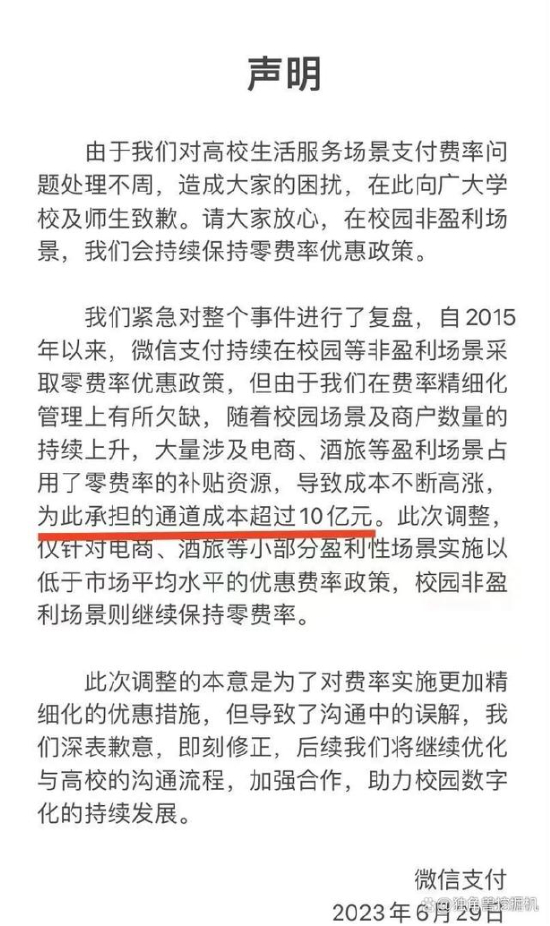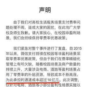 从腾讯的表态来看,此次调整是为了对费率实施更加精细化的优惠措施,校园内非盈利性支付场景挤占零费率的教育补贴资源,导致成本不断增加,在第二次回应的“秒删” 版本中,微信支付透露“为此承担的银行通道成本超过10亿元”。