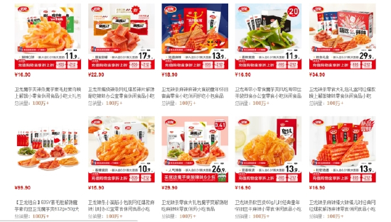 在线上电商平台上,卫龙销量最大的爆款产品,种类是相对单一的,基本都是调味面制品。