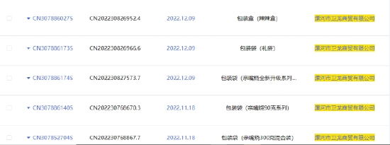 从国家知识产权局线上检索数据看,漯河市卫龙商贸有限公司目前有85项实用新型专利,主要为产品包装盒、包装袋、摆放架等,涉及到产品种类包括:亲嘴烧、麻辣麻辣、风吃海带、魔芋爽、面筋、辣条、麻辣棒、鸡粒丽、卤蛋、豆皮、薯片、杂粮时代、臭豆腐、薯条、鸡蛋干、香肠、凤爪、鸡腿、木耳、豆干、蔬菜脆、锅巴、兰花豆等多种。
