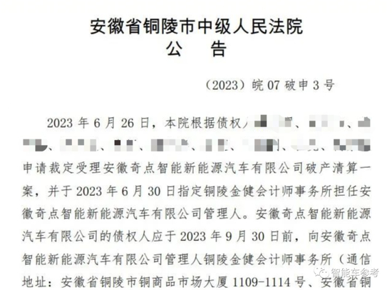 7月5日,安徽省铜陵市中级人民法院发布公告称,2023年6月26日,铜陵中级人民法院根据10位债权人的申请裁定受理安徽奇点智能新能源汽车有限公司破产清算一案,并于2023年6月30日指定铜陵金健会计师事务所担任安徽奇点智能新能源汽车有限公司管理人。