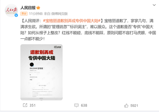 对此,人民日报微博评论称:宝格丽道歉别弄成专供中国大陆!宝格丽道歉了,寥寥几句,满满求生欲。所谓的“管理疏忽”“标识误注”,难以服众。这个道歉是否“专供”中国大陆?如何从根子上整改?红线不能碰,底线不能踩,原则问题不容打马虎眼,中国一点都不能少!