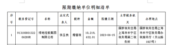 值得注意的是,国家税务总局上海市长宁区税务局网站于近日披露,绿地控股集团有限公司因欠增值税10,219,632.01元被公示,该集团法定代表人为:张玉良。
