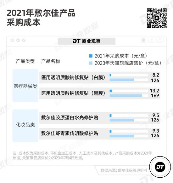 “妆字号”产品中,胶原蛋白水光修护贴采购成本为9.5元/盒,虾青素传明酸修护贴为9.3元/盒,而售价都达到了126元。