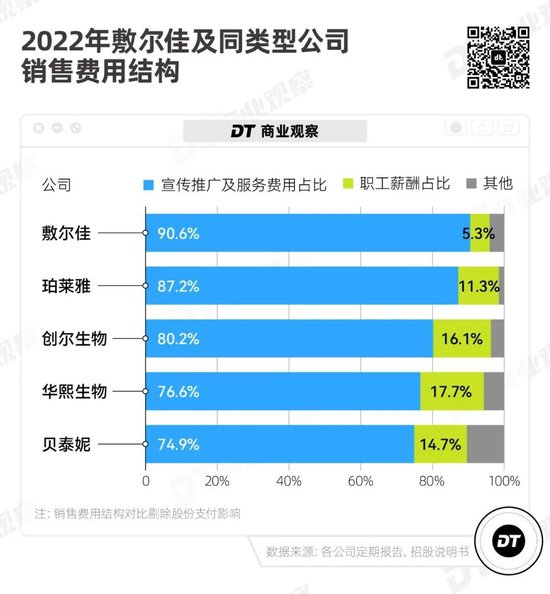 敷尔佳在招股说明书中称,“发行人与同行业可比公司销售费用结构具有一致性,均以宣传推广及服务费用、职工薪酬为主”。