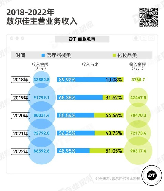 2022年,敷尔佳化妆品产品收入9.03亿,首次超过医疗器械。目前,敷尔佳51种产品中,46种都是化妆品,医疗器械类产品仅5种。