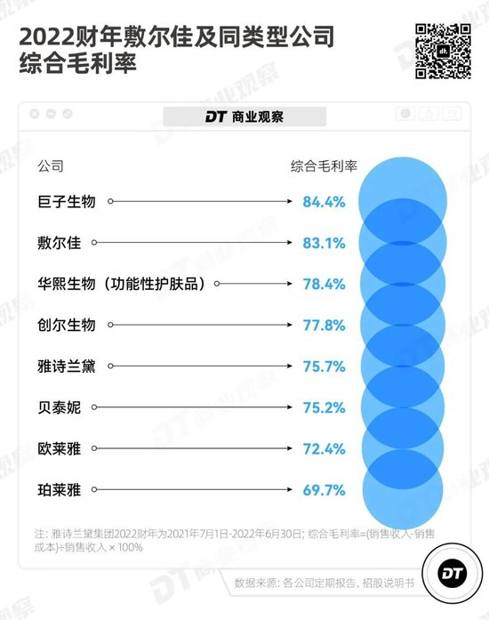 敷尔佳的产品附加值的确很高,相比同行,毛利率也高于平均水平。