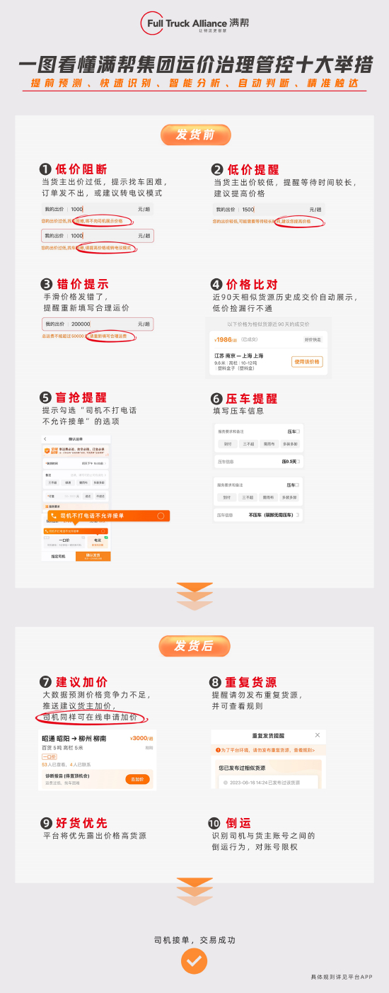 数据显示,今年以来,满帮平台日均触发阻断去重货量超过4万单,重货率下降了30%。触发低价提醒日均货量近5万单,发货后价格优化日均货量达3万单,价格优化率达到了7.5%。