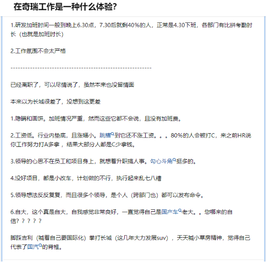 知乎上有个问题,在奇瑞工作是一种什么体验?