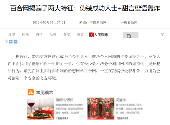 但在网站逐渐做大的过程中,百合网也遇到了不少困扰。比如网站已经通过实名制、服务审核、技术屏蔽和会员投诉机制竭力净化交友环境,但还是有不少骗子混迹其中。为此百合网甚至专门开辟了一个版块介绍常见骗术,依然拦不住有会员死心塌地地给骗子转账。