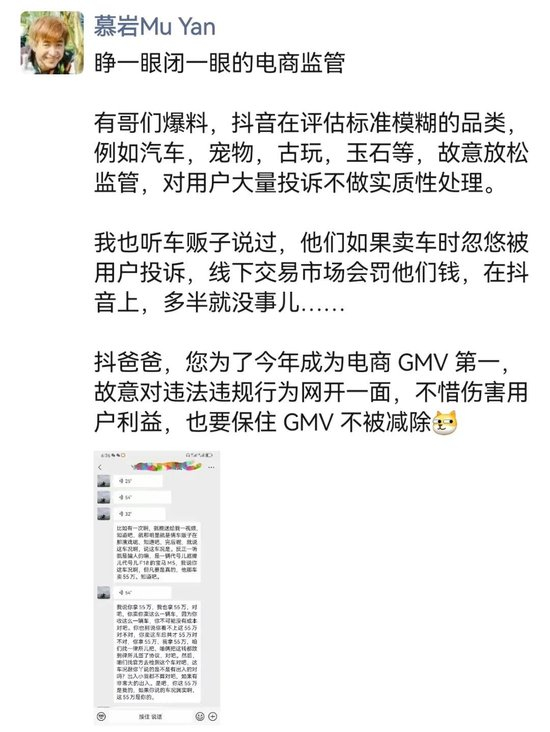 在最新发布的录音中,慕岩又添了几项对抖音的指控。其称抖音对于要看品相的商品,标准比较模糊,比如玉石、古玩、汽车等,常对用户大量投诉不做实质性处理;还称抖音有假量的问题,在抖音做电商买流量,有时会买到假流量。
