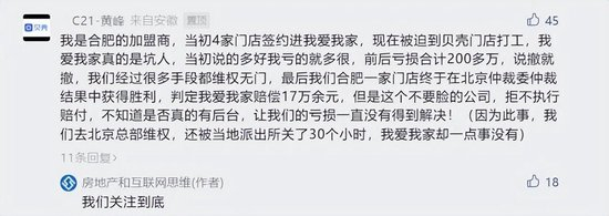 我爱我家接着曝出了大量加盟店维权事件,比如2022年6月初,我爱我家要求合肥140多家加盟门店店东解约但不给钱。合肥加盟商爆料称在仲裁后依旧没拿到钱,跑去总部维权,反被关30多个小时。