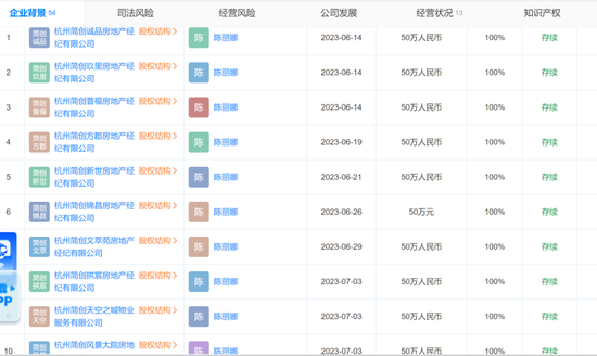通过天眼查查询,杭州简创房产经纪公司在5月成立,在6月一下注册了48家门店,有时一天就注册好几家。陈毅就是传闻中的简创幕后老板,其“自立门户”的说法或被证实。